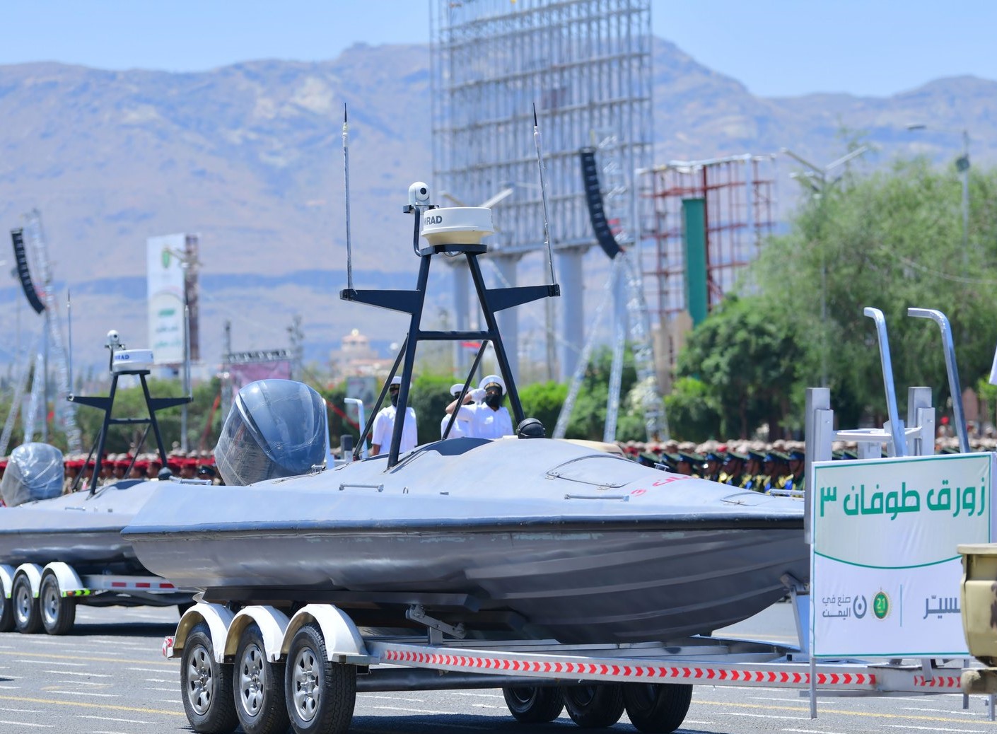 زورق هجومي مسيَّر، كشفت عنه الحوثية خلال استعراض عسكري بالحديدة في سبتمبر 2023م.