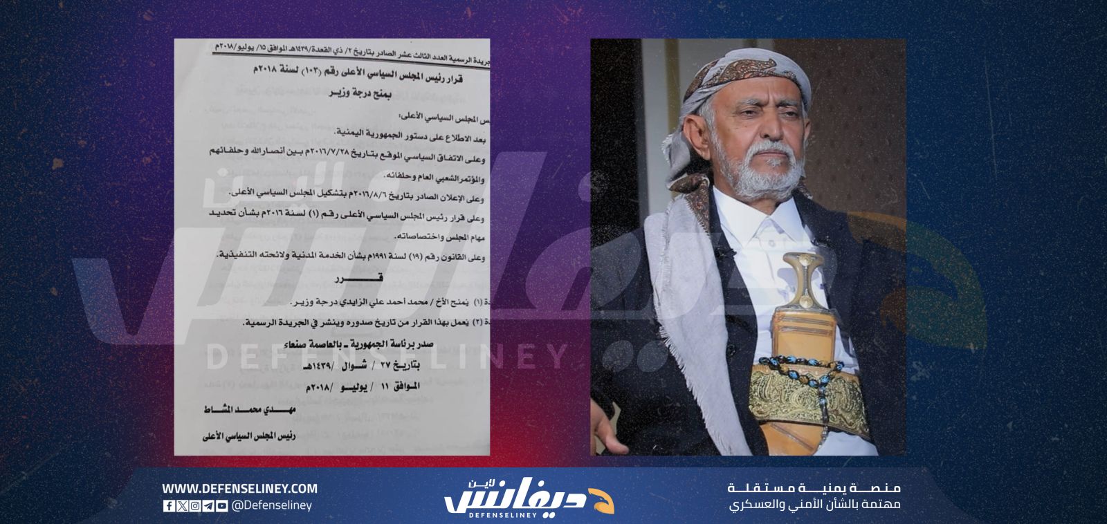 وحصلت منصة "ديفانس لاين" على وثيقة قرار أصدره رئيس المجلس السياسي الأعلى للحوثيين، 11 يوليو 2018، بمنح محمد أحمد الزايدي "درجة وزير".